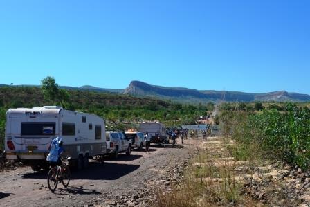 Finally we arrived at the Pentecost crossing, it was like peak hour traffic as they allowed a group of cyclists to cross, then support vehicles, then more cyclists. It took nearly half an hour before it was our turn and on the other side there was no space to stop and take photos so we just had to keep going. The cyclists were spending the night at El Questro station and it was only as we approached the station turn off that the number of cyclists started to thin out.