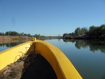 The action died off so we moved to another spot but 4 hrs later and many good snags later all we had to show was several hook ups, no barra landed and numerous cat fish. In the last hour we moved back upstream and trolled lures behind the boat past a group of sunken trees and within the first 5 mins the guy who threw the barra back in the morning had another legal size barra in the boat. As luck would have it, I was on the side of the boat furthest from the trees and the barra were not venturing out that far. Finally with the boat turned around and trolling next to the trees I got a hit, but from the start it did not feel particularly big. I did land it and sure enough it was 53 cm, just 2 cms short. After 6hrs on the water it was back to camp with nothing and facing the prospect of baked beans on toast as I had confidently told Jacky not to lift any meat out of the freezer because I was bringing home fish for tea. Instead we had fish and chips at the Lake Argyle Café