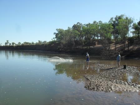 I was told the pickup would be at the Kununurra Visitor Centre at 6:00 am. With an hour’s drive to Kununurra I had to set the alarm for 4:30 am. Pretty darn early wake up call for a holiday. I arrived in town only to find the pickup was 6:30, half an hour of sleep wasted. We were in the water by 7:30, cruised about 7 kms downstream to a mud bank, passing numerous saltwater crocodiles on the way. where we set about catching live bait with a throw net. There were 3 clients plus the tour guide in the boat. The guide was catching baitfish with a throw net, one person was asked to hold the bucket and the other two were asked to keep watch for crocodiles.