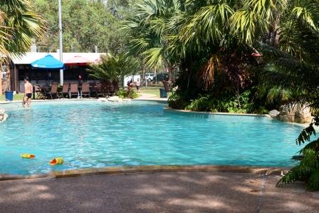 It was still pretty warm when we arrived back at camp and there was a very attractive pool at the campground, mind you it took a couple of hours to get Jacky out of the book she was reading but we finally got in the water around 5:30. We were just getting out and about to head back to cook some tea when some guy picks up a guitar and starts singing in a voice very similar to John Williamson. So we hung around a little longer and as it got dark the idea of cooking tea receded as the smells from the poolside kiosk wafted over the pool. They were selling scotch fillet steaks with salad for $28, it didn’t take long for Jacky to twist my arm and tea was ordered. Mind you the backpacker cooking the steaks didn’t seem to understand medium-rare, we had to keep the fork in them to keep them on the plate.