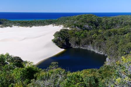 The plan for today was to explore the lakes and rainforest in the southern half of the island. We headed up the Cornwells Break Rd, near our campsite to Stone Tool sand blow (blowout), there are quite a few of these large open areas of shifting sand. From here we continued to the Lake Waddy lookout. Lake Waddy is the deepest lake at 11.5m and is characterised by the large sand dune that is slowly filling the lake in one metre per year, its popular for sand boarding into the lake but with the cool weather and 1.4 km hike down to the lake we decided to move on.