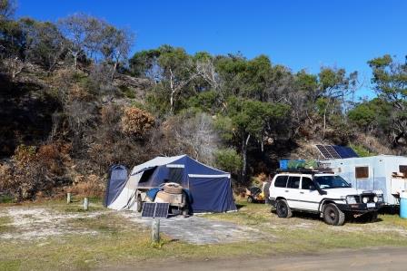 Today is the next big challenge, can the 100 series pull the camper trailer through the soft sand around the Indian Head bypass. This prospect has had Jacky concerned for some weeks now, mostly due to the fact that she watched a 4WD Action DVD that showed the drama Graham & Shaun had towing a large boat and a camper trailer around the bypass earlier this year. The reason for her concern was that if those guys with all their experience had trouble how would we manage it by ourselves. It took nearly an hour and a half to do the 60 kms to Indian Head from our Cornwells campsite and what do we see when we arrive? One vehicle attached to another vehicle pulling a large boat by a snatch strap and about 8 strong guys pushing the boat & trailer. Just what Jacky was concerned about. It took nearly 30 mins for them to get the boat and trailer around and I spent that time reducing the air pressure in my tyres some more just be certain. I had some advice previously from a local person and that was to let your tyre pressures down and drive like you stole it. With that in mind it was into 2nd gear low and put the foot down, with the revs near 4000 we powered through without any issues. From there it was up past Champagne Pools and onto the Waddy Point track. I had booked the beachfront site not aware that there were sites in a sheltered, enclosed area near the ranger’s house. We initially thought about moving in on one of these sites even though booking system showed them all booked but it turned out the beachfront site was quite sheltered by the point and even though it was quite windy in other places on the island it didn’t get stronger than a slight breeze on the beachfront site. All Jacky was looking forward to was 5 nights in the one place.