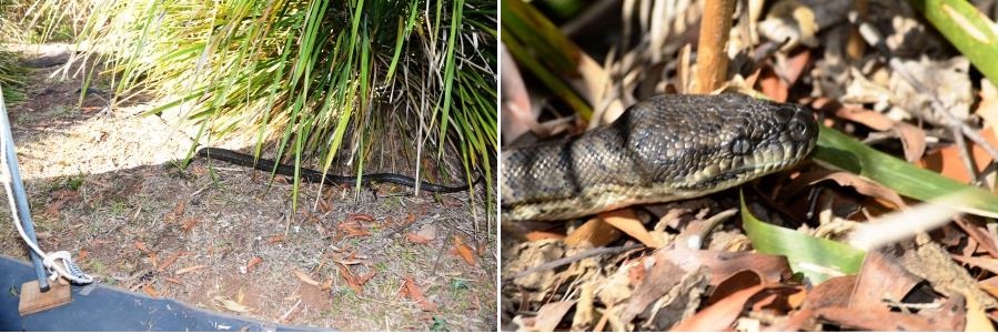 Packing up today was more interesting than usual; we had a visit from a 3 mtr carpet python. First, I nearly stepped on it as it slid pass the tent, then it coiled itself in the sun just 1 mtr from the tent for nearly 30 mins before sliding off into the bush. Despite assurances that it was non-venomous Jacky kept well away and totally avoided that side of the tent.