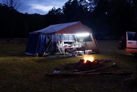 Today we drove through some narrow and steep forest roads to a little town called Comboyne. I was a little low on fuel so we thought we could fill up and get some lunch. Not likely, the last time the fuel bowsers had been used looked like about 30 years ago and lunch wasn’t an option either. They recommended we drive to Wingham. Wingham is a much larger country town and we enjoyed a $18 scotch fillet steak and trimmings for lunch at the local services club. After a look around town we headed back to camp from a completely different direction and put our faith in the GPS. The first attempt ended in a closed road, the bridge had been washed away many years ago and never replaced. In the next attempt we headed towards the small town of Lansdowne, then through many small farming communities to another road that was clearly marked no through road. I decided to take a risk and have a look, about halfway down we came across a forest track called Green Hwy which we had seen earlier in the day as we drove out to Comboyne. My faith in the GPS was somewhat restored. We travelled along this road for about 10 kms then the GPS directed on to Pimlik trail which was basically a fire trail. It was a very overgrown track that had not been used in sometime, after about 5 km of pushing through shrub we were debating if we should turn back, but a check on GPS showed we were heading in the right direction so we decided to push on. The options to turn around were very limited. Finally we came to a fairly steep hill and a few more obstacles, the first tree branch Jacky was able to move while I drove around it, the second tree required the axe to cut and move and just as we got near the top there was a tree about 30cm thick, 50 cms off the ground and it extended 4-5 mtrs back in the scrub on both sides of the track. This moment I had purchased the chainsaw for. 20 mins later the tree was in numerous pieces and we were mobile again, another 10 mins we came out onto a forest road that we recognised that went back our camp
