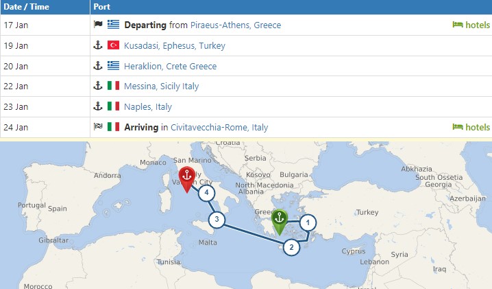 First Stop is Ephesus, Turkey, then on to Heraklion, Crete, Messina, Sicily, Naples and Rome