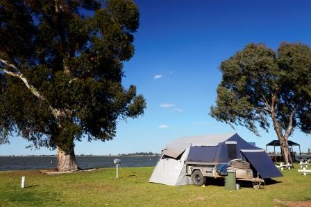 Now it is run as a sheep stud but is not open to the public - Day 147 Sat 06 SepToday we are headed for Swan Hill, another historic town on the Murray River. I had been unable to locate any free or bush camping near Swan Hill so we decided to stay in a caravan park this time. We only had 160 kms to cover today and we decided to stick to the Murray Valley Hwy and get into camp as soon as possible so we could get some washing done and leave tomorrow for exploring. I had picked a caravan park from the GPS that was just before Swan Hill on Lake Boga. When we arrived we found out that the caravan park certainly was on Lake Boga, right on the edge. In fact there was enough room for one row of sites on the lake edge, a small roadway and another row of cabins and on-site vans, then the fence and then the highway. I was a little concerned about the highway noise but the manager assured me it was pretty quiet after 10 pm. The site was grassed and right next to a large freshwater lake. There was a nice fresh breeze coming from the lake and we had most of our washing dry that afternoon. What the manager failed to mention was the regular freight trains that passed through the nearby town of Lake Boga, sounding their horns at every level crossing. The last train was at midnight and the first one at 5 am.